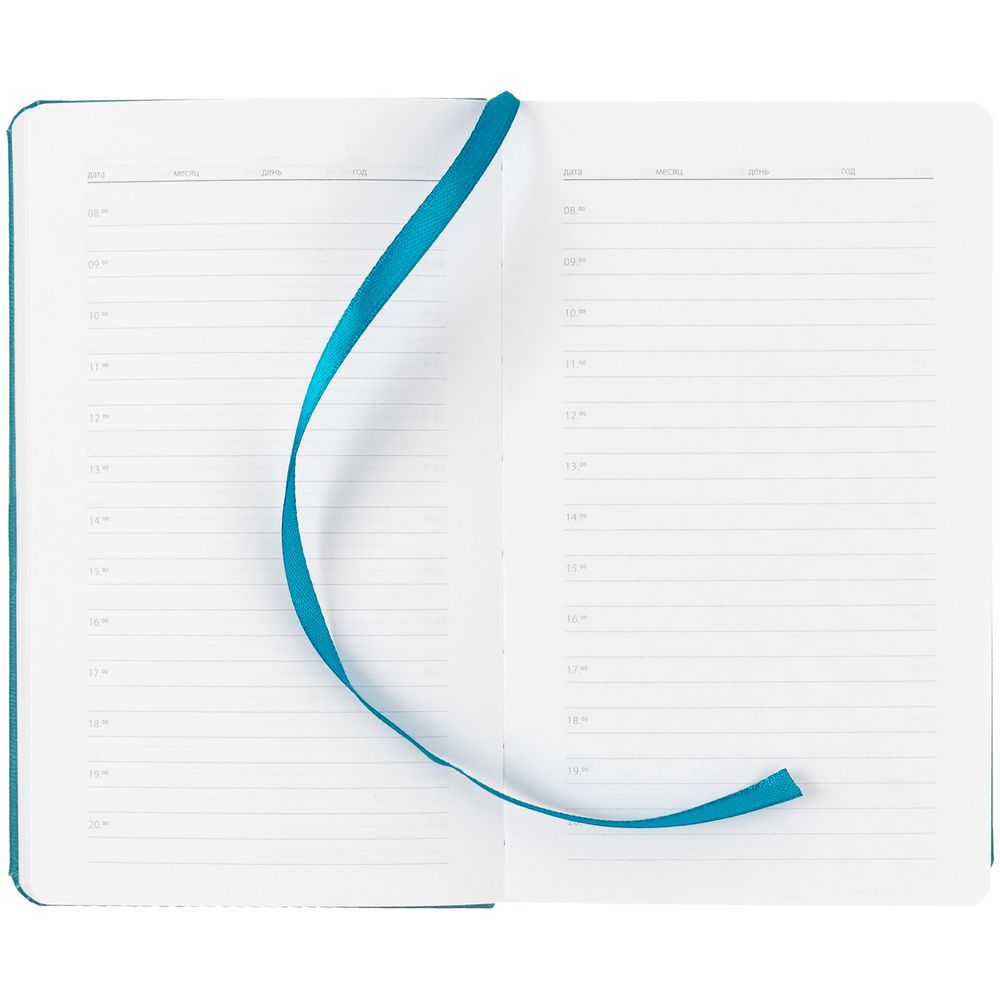 Ежедневник с твердой обложкой, выполнен из материала Brand, цвет морской волны II, дополнен ляссе в цвет обложки.