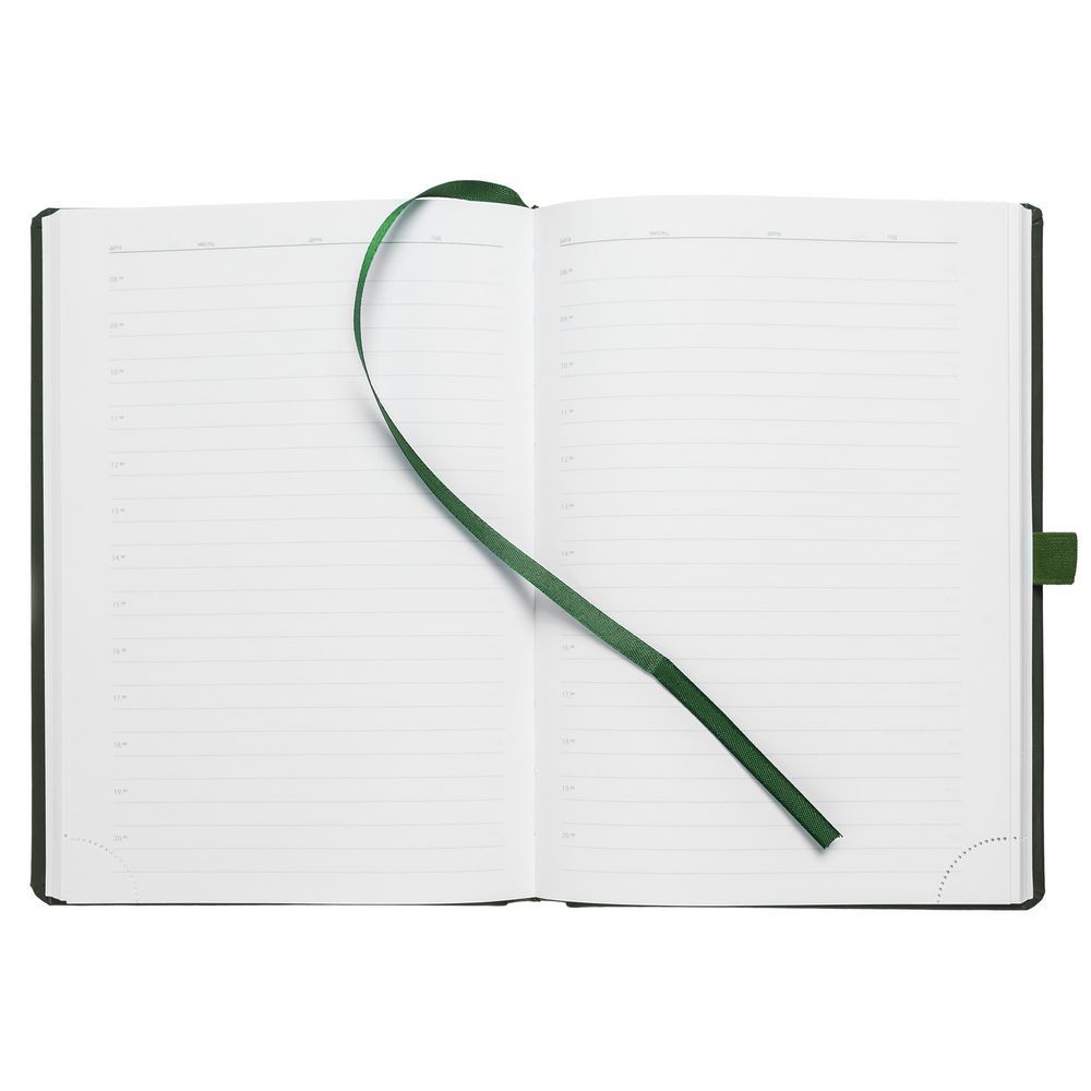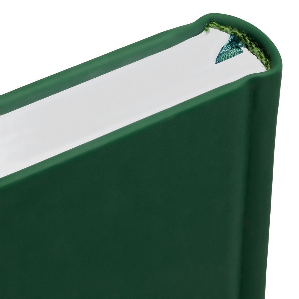 Ежедневник с твердой обложкой без поролона, выполнен из материала Soft Touch, зеленый FF, дополнен резинкой шириной 1 см, петлей-резинкой для ручки, капталом и ляссе в цвет обложки.