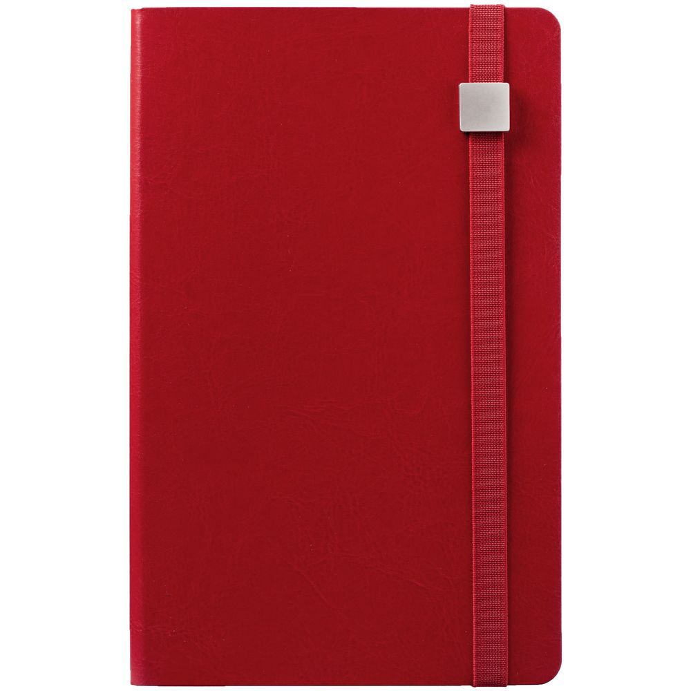 Ежедневник с гибкой обложкой, выполнен из материала Nebraska, красный РР, дополнен резинкой с металлическим шильдом и ляссе в цвет обложки.